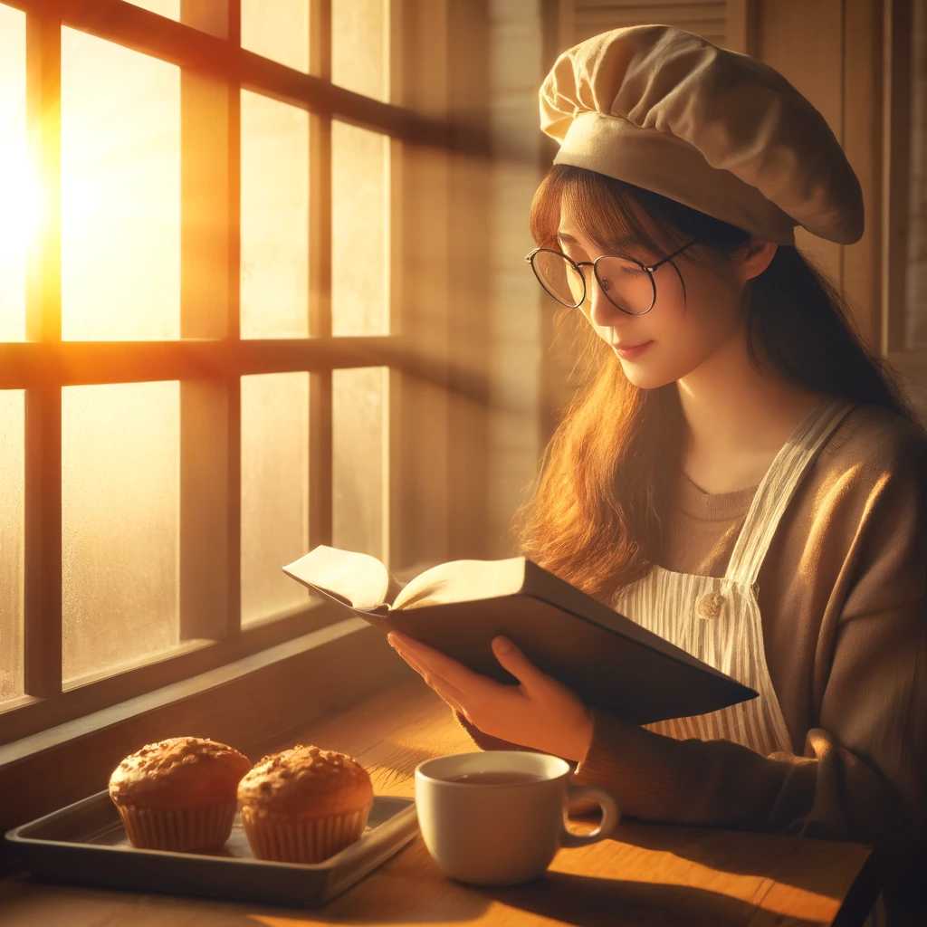 "햇살이 따뜻하게 들어오는 창가에서, 안경을 쓰고 베이커 모자를 쓴 한국 여성이 성경을 읽으며 차를 마시는 모습. 평온한 아침의 분위기 속에서 신앙과 일상의 균형을 찾는 순간을 담은 이미지."