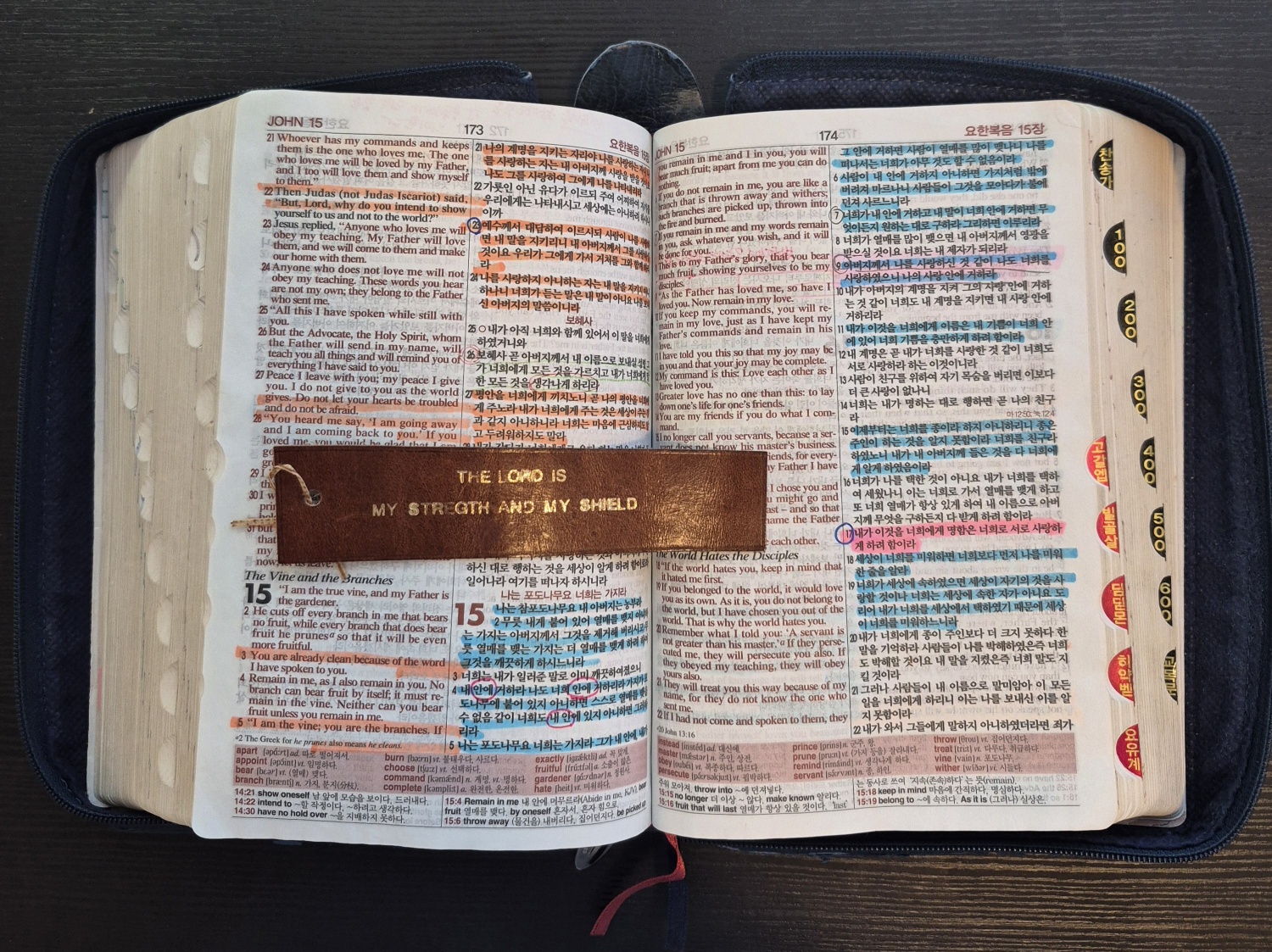 "요한복음 14장 27절이 강조된 성경책. 다양한 색상의 형광펜으로 밑줄이 그어져 있고, 'The Lord is my strength and my shield'라는 가죽 책갈피가 놓여 있다. 깊은 묵상과 신앙을 상징하는 장면."