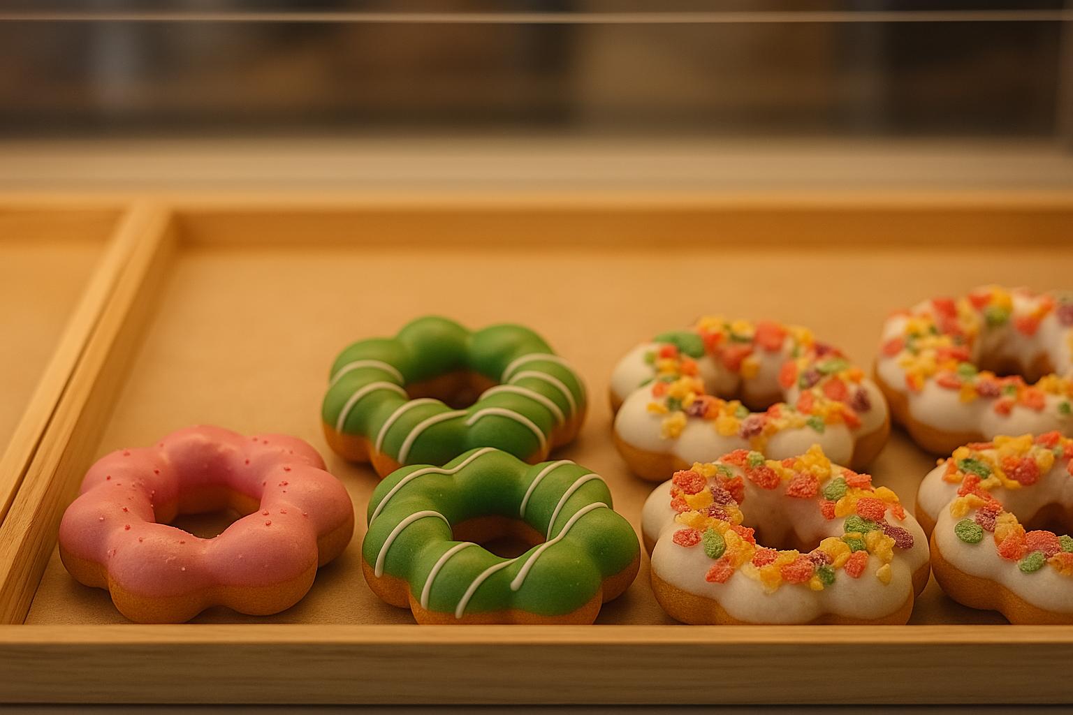 "핑크, 말차, 시리얼 모찌 도넛이 진열된 나무 트레이"