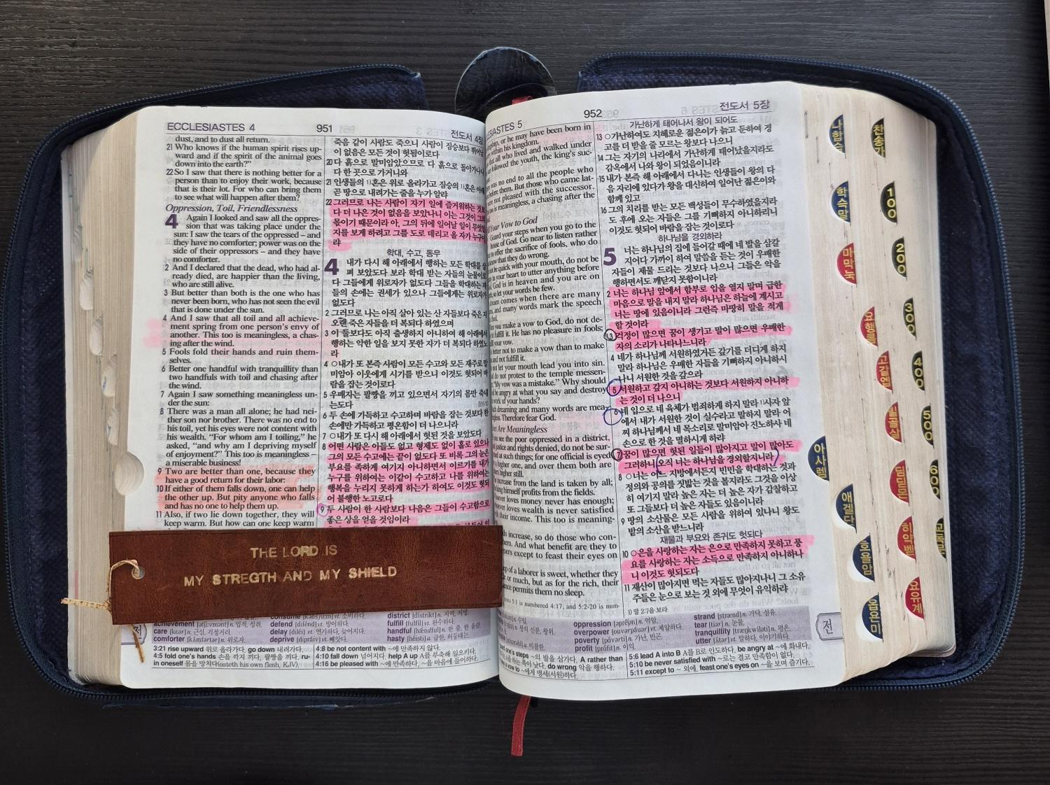 "전도서 4장이 펼쳐진 성경책, 영어와 한국어 본문이 형광펜으로 강조되어 있음"