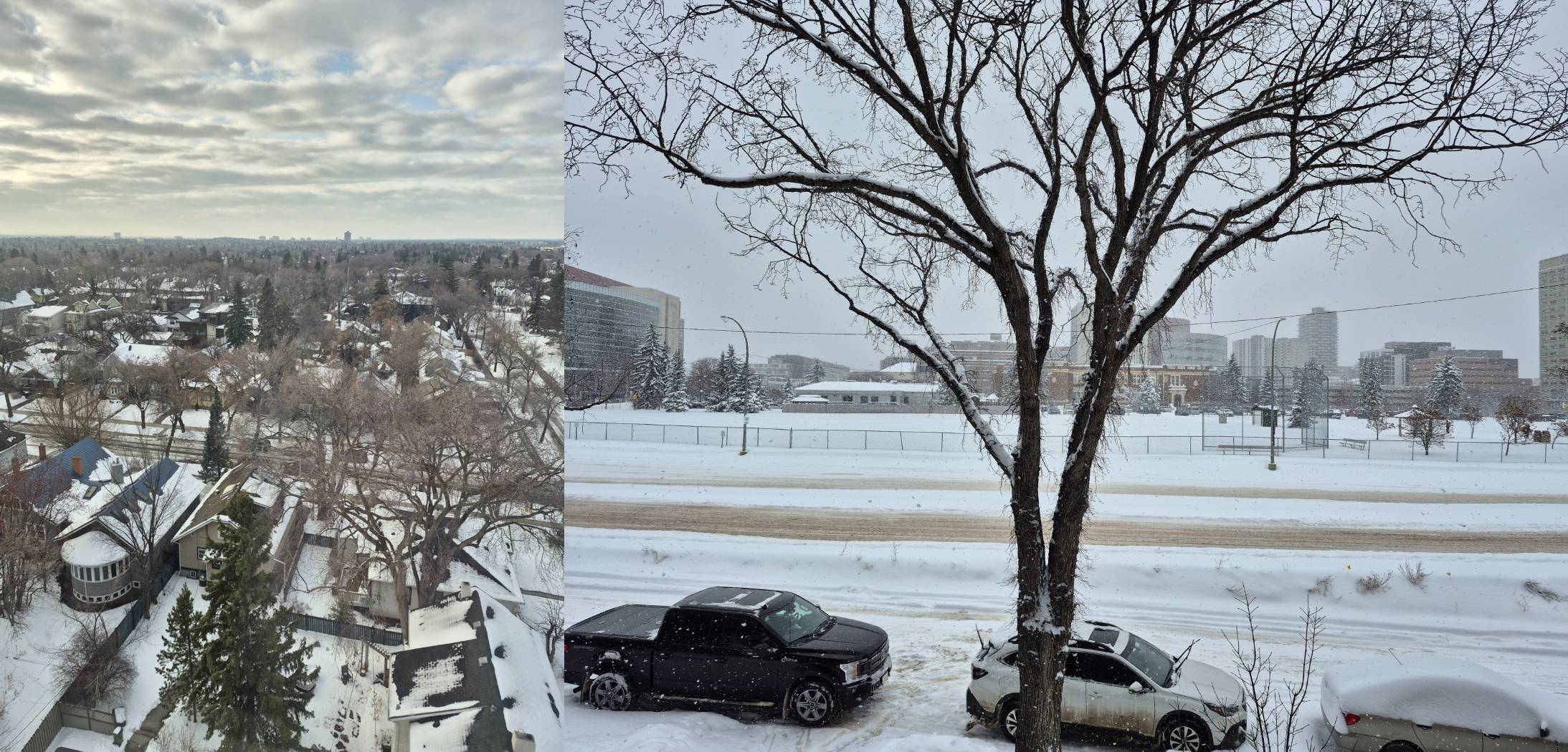 11층 고층아파트에 사는 벤이 바라본 애드먼튼 도시 전경과 2층 콘도에 사는 내가 바라본 대학과 병원 앞 거리의 눈 내린 풍경을 비교한 사진. 같은 도시에 살지만 서로 다른 시선을 보여주는 이미지.