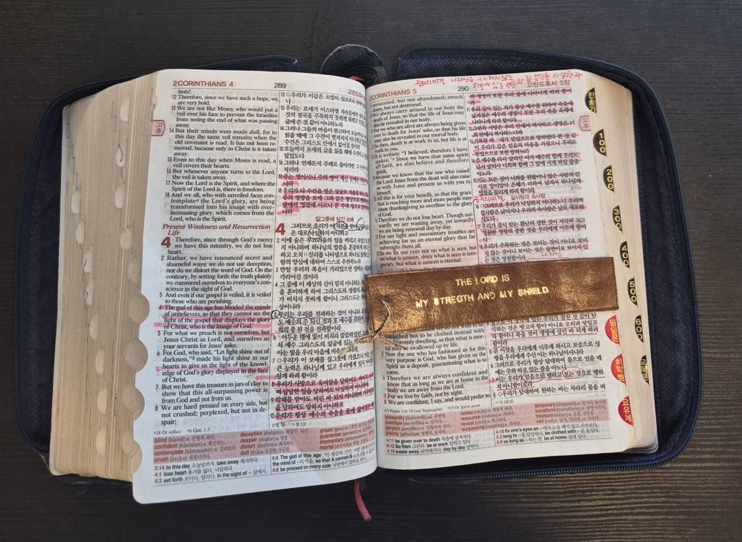 고린도 전서 4장 18절이 보이는 영한 사전이 펼쳐져 있다.