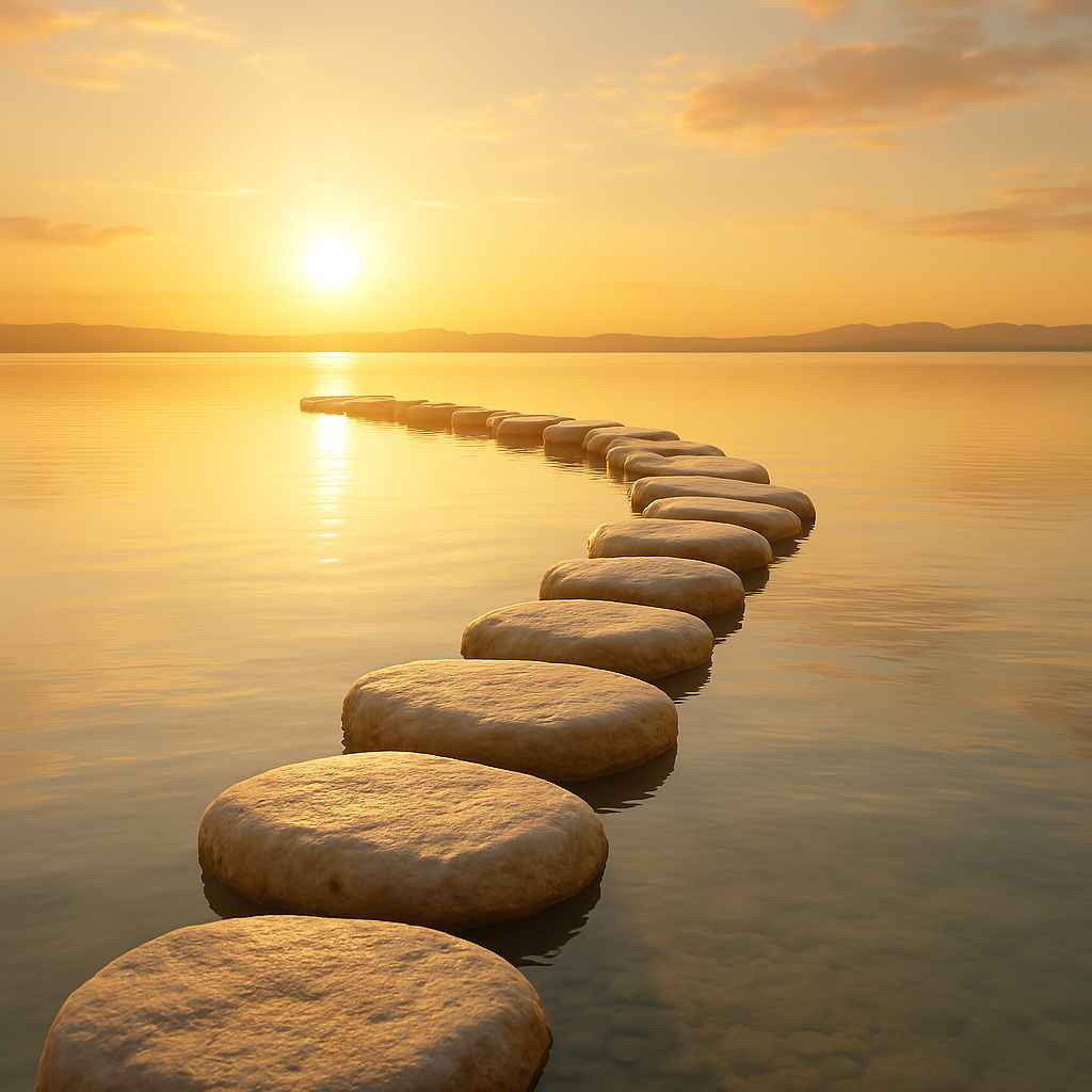 노을 아래 물 위에 놓인 둥근 징검다리 풍경, 이방의 빛으로 가는 평화로운 여정 상징