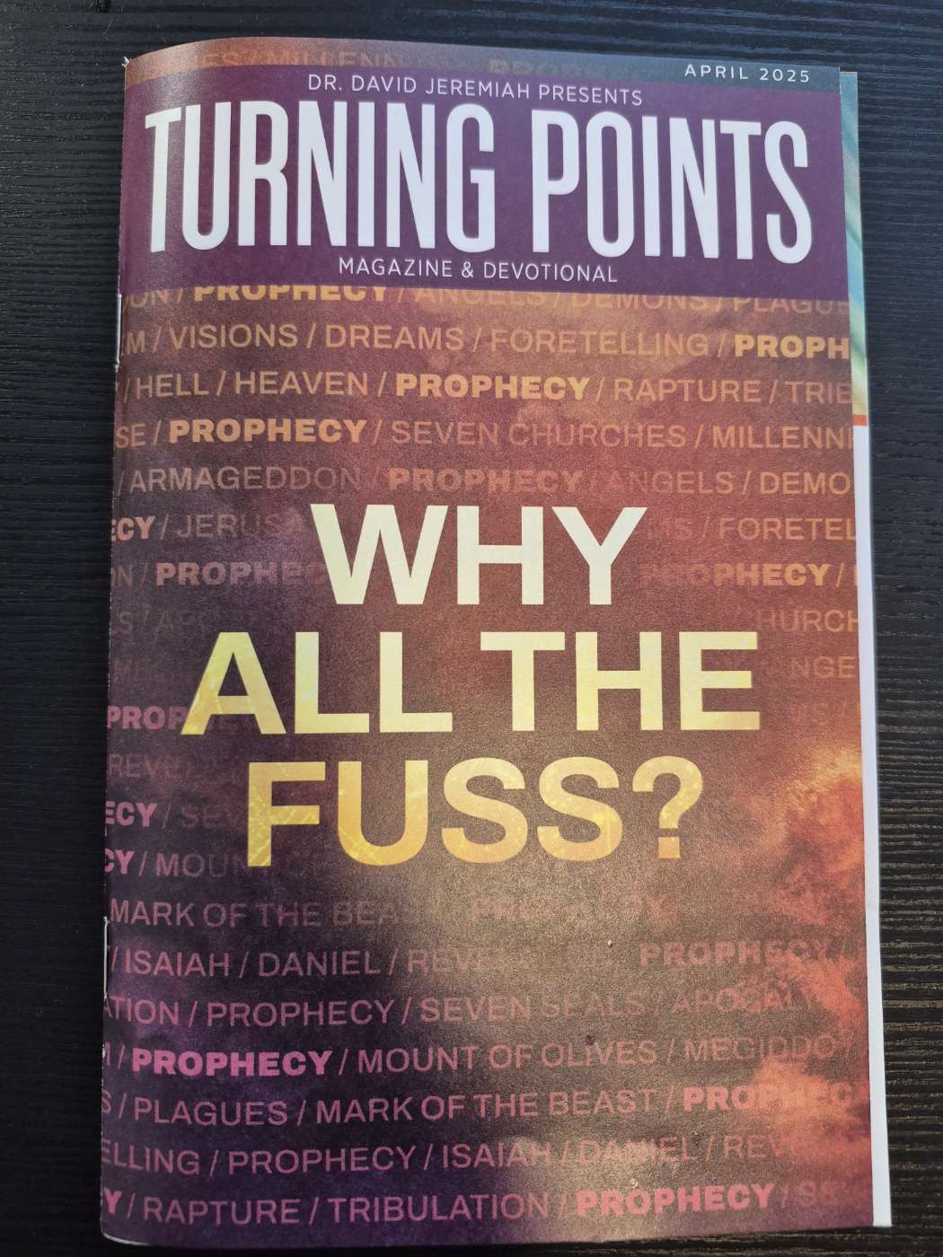 Turning Points 잡지 2025년 4월호 표지. 붉고 어두운 배경에 "WHY ALL THE FUSS?"라는 제목이 큼직하게 적혀 있으며, 주변에는 prophecy, revelation, Isaiah, Daniel 등의 단어들이 배경으로 반복된다.
