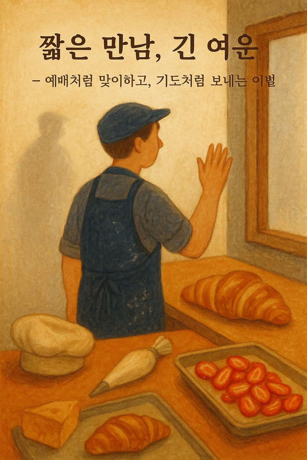 짧은 만남, 긴 여운” – 베이커리 창가에서 손을 흔드는 제과사의 작별 인사를 담은 따뜻한 수채화 스타일의 이미지. 예배처럼 맞이하고 기도처럼 보내는 작별의 순간을 표현