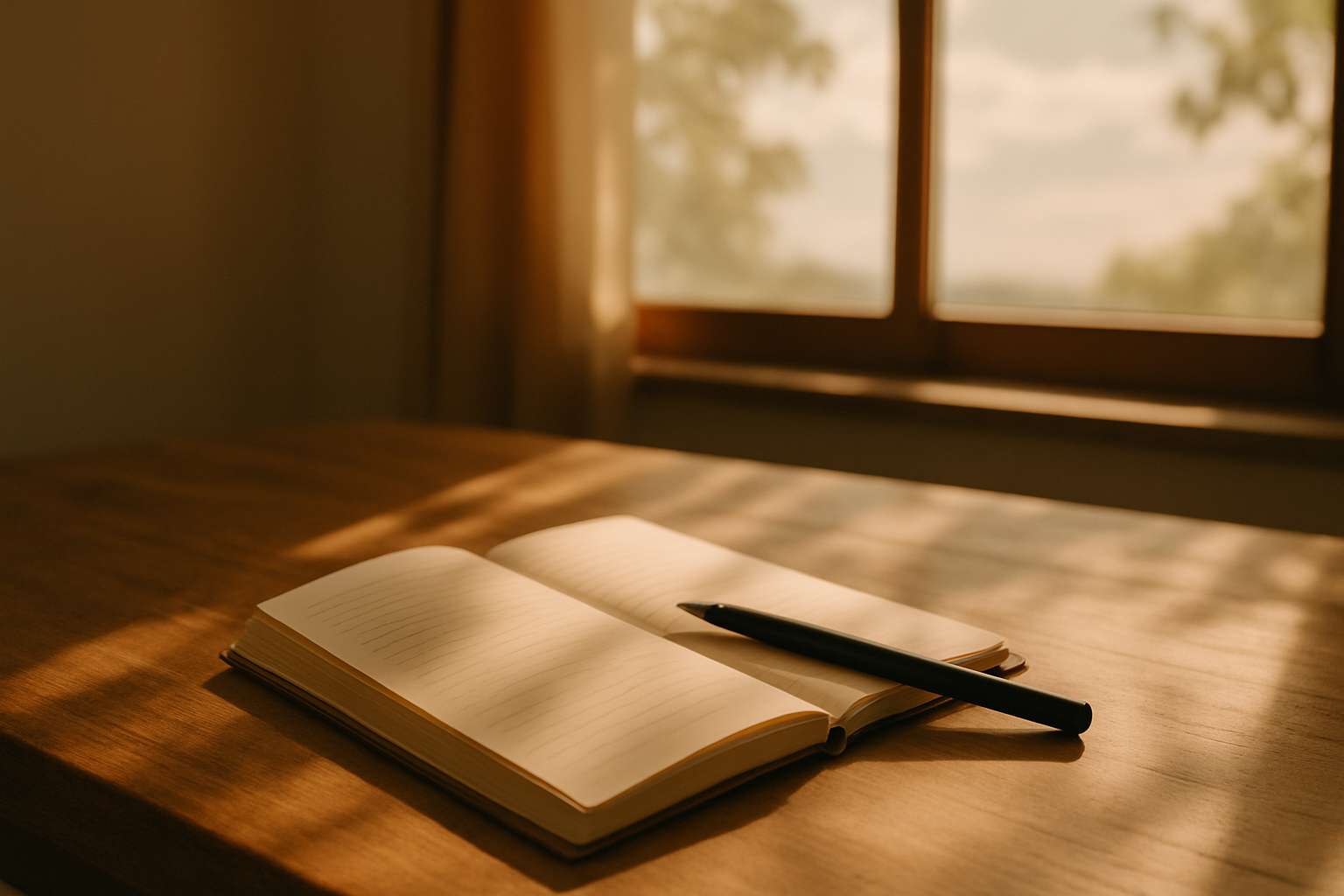 햇살 아래 펼쳐진 노트와 펜, 기록하는 중년의 고요한 일상