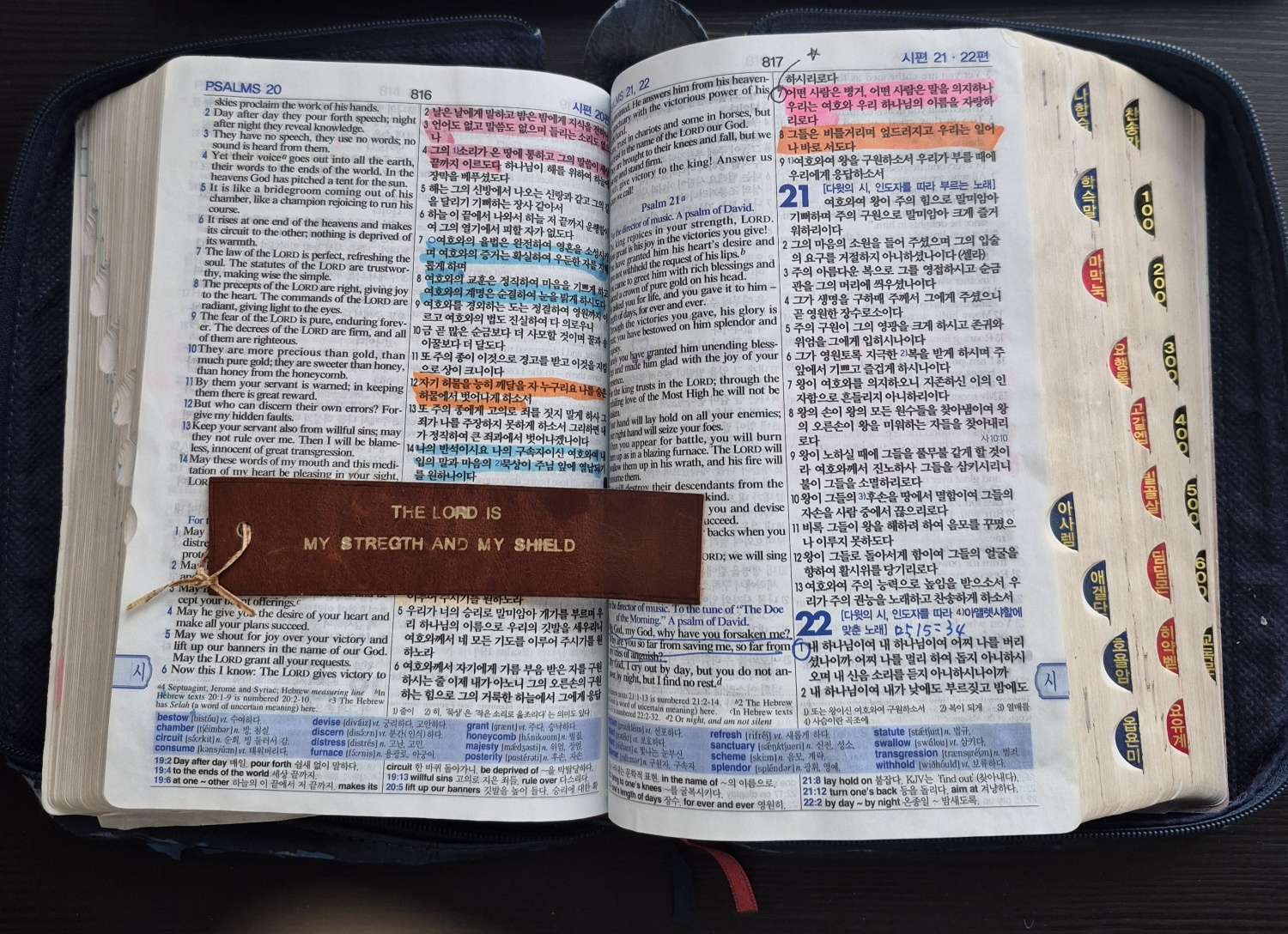 시편 19편 14절 영한성경이 펼쳐져 있는 모습